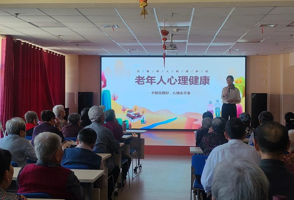 首先,周霞老师以生动的授课形式进入主题,通过多种事例讲解了长期不良情绪不仅会诱发各种疾病,还会影响心理健康。同时介绍了产生老年人心理问题的原因以及心理疾病预防方面的知识,现场传授心理疏导的基本方法和技巧。