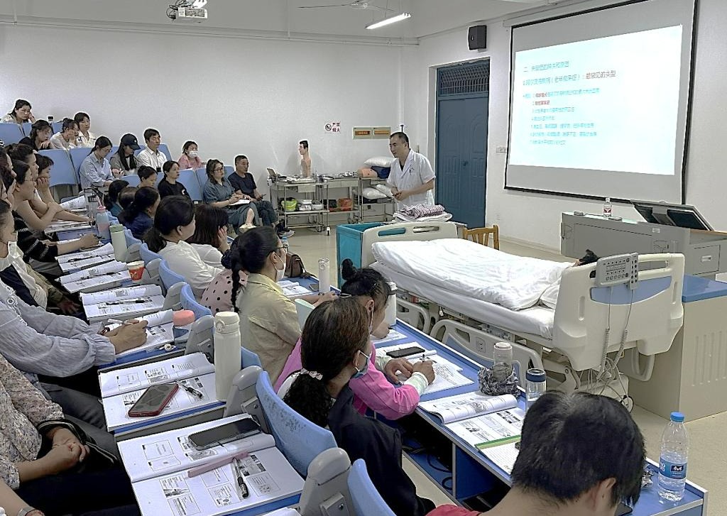 为进一步提升全市养老服务护理人员综合素质,满足老年人多样化、专业化养老服务需求,打造一支德技兼备的养老服务人才队伍。由滁州市民政局、滁州市人力资源和社会保障局主办、滁州城市职业学院承办的2024年度全市养老服务护理员培训班,于2024年5月20日在我校护理学院举办了开班仪式。民政局养老服务科科长钱尼兵做了开班动员报告,护理学院副院长左晶晶强调了培训班的学习和纪律要求。