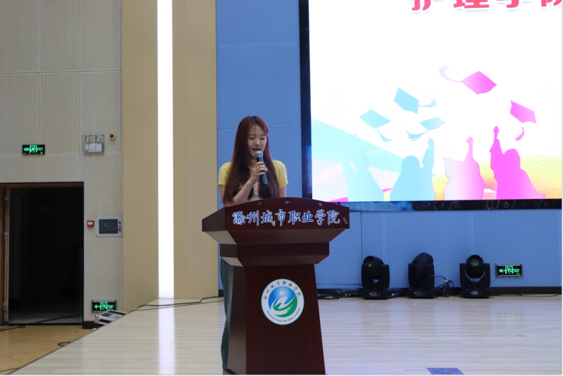 接着,优秀毕业生代表朱琦同学分享了实习和升本给她带来的成长和收获。她感谢母校提供了优越的学习环境和丰富的学习资源;培养她扎实的专业素养和严谨的工作态度。接着,朱琦同学分享了自己升本的经历。她表示,升本对于她来说是一个重要的转折点,通过不断地学习和积累,她成功地通过了升本考试。她鼓励学弟学妹们要珍惜大学时光,努力学习专业知识,积极参加实习活动,勇于面对挑战和困难,不断追求自己的梦想和目标。