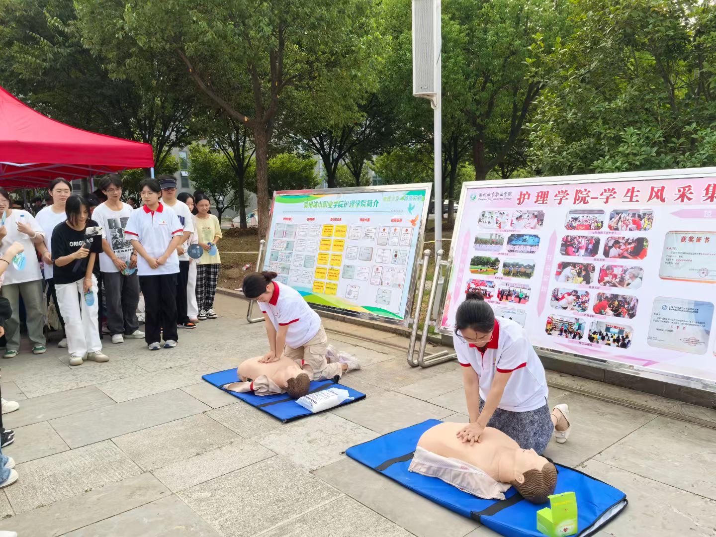 护理学院为新生们准备了拍照墙和祝福语KT板,绿色通道快速暖心,为新生的大学生活留下美好的记忆,给他们营造一个更好的入学氛围。在护理学院报到处,学院党总支书记蔡季秋和副院长李勋华带领学院老师们展示应急救护基本技能,引得众多新生和家长驻足观看,“萌新们”都兴趣十足,有几位更是在老师们的指导下上手实操,这一过程让他们对即将开启的专业学习充满期待。