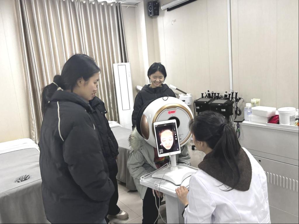 理论知识讲解结束后,同学们前往美容实训室参观。在这里,专业人员为学生提供免费皮肤检测服务,通过科学仪器分析,让同学们更直观了解自己的皮肤状况,现场学习针对性护理方法。同学们纷纷表示,此次活动干货满满,不仅解决日常护肤困惑,还为今后科学护肤打下基础。