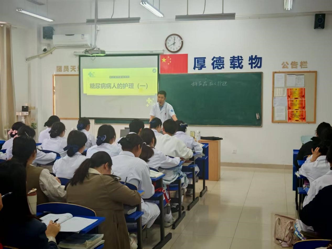 为了提升青年教师的教育教学水平,促进教师专业成长,护理学院健康管理系朱云林老师于2025年4月10日上午第1节课在仁心楼-307开展了《糖尿病病人的护理》的公开课教学,本次公开课由护理学院副院长张瑞修主持 ,21护理初专2班同学和学院无课教师参加了本次活动。