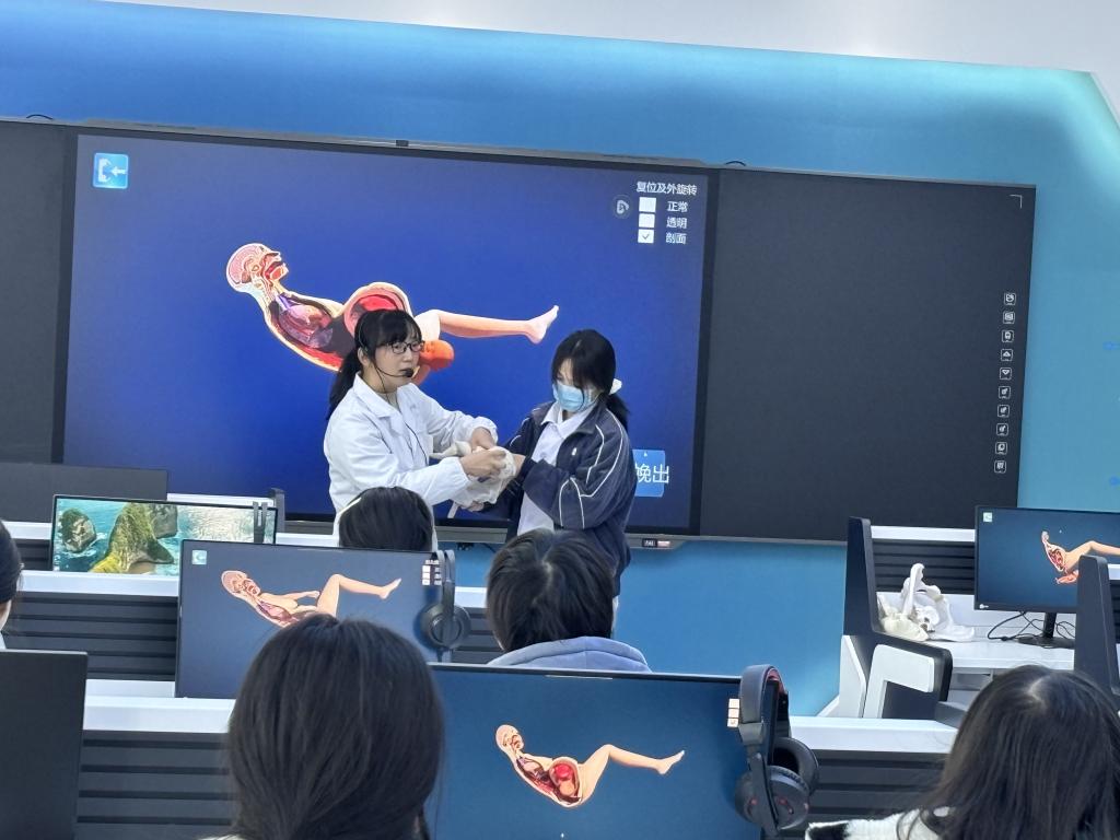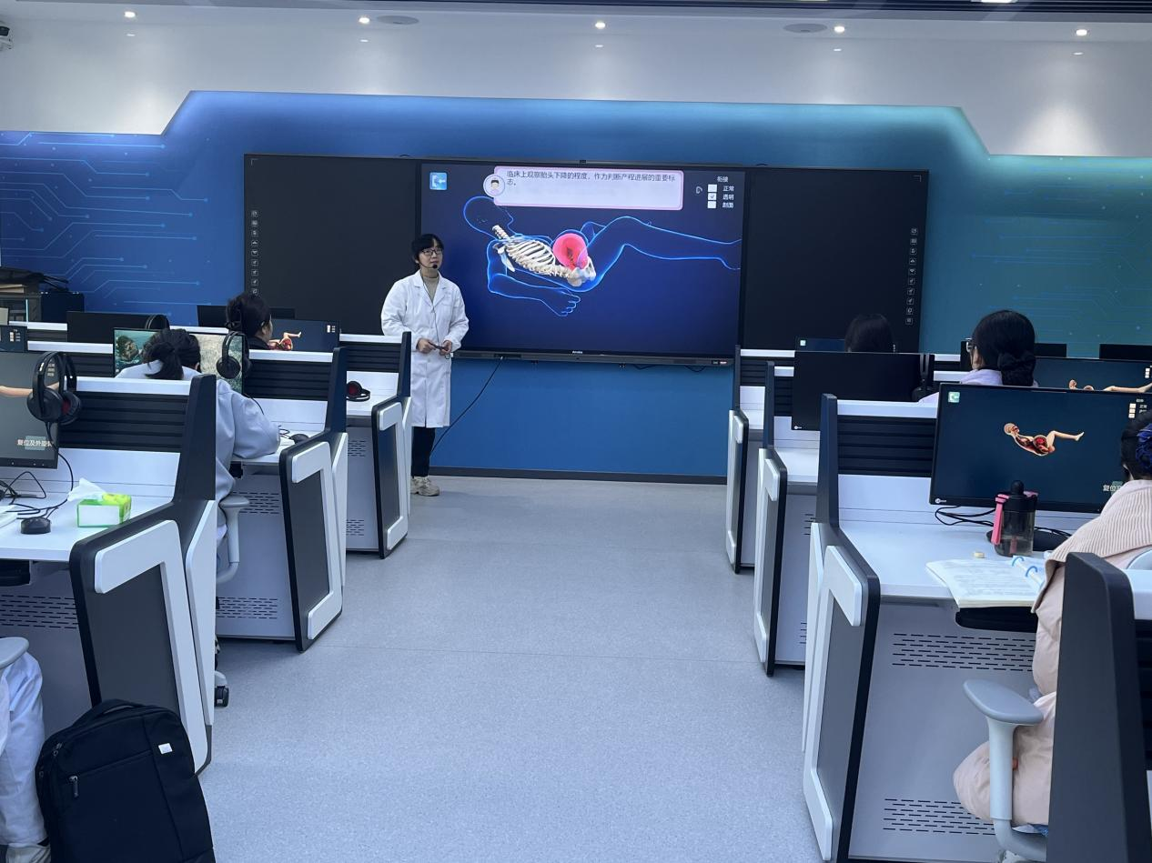 课堂上,甘乐霞老师以PC端虚拟仿真系统为核心,动态、立体地演示了分娩全过程,将抽象的机制转化为直观影像。她巧妙结合PPT课件与骨盆胎儿模型,形成了“虚拟、理论、实体”三位一体的教学闭环,有效突破了教学难点,课堂节奏流畅,学生专注度高。