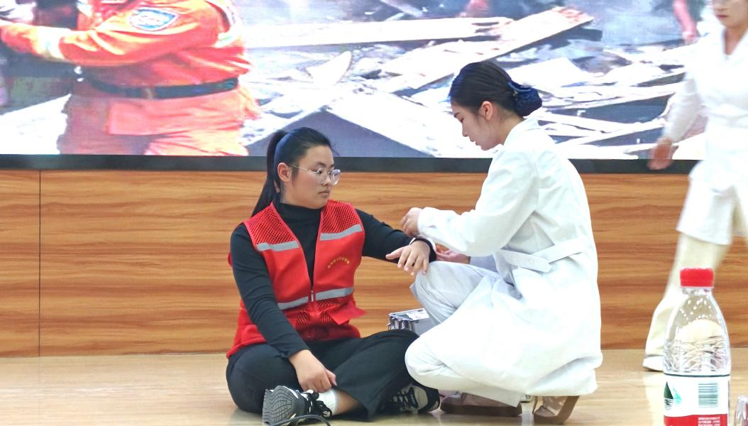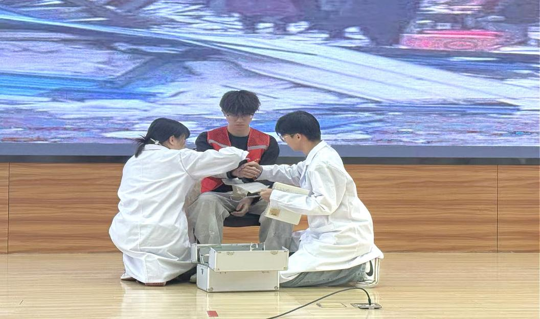 决赛现场氛围庄重而热烈,“学习急救技能 护航生命安全”的标语醒目悬挂,评委团由学校护理专业骨干教师及校红十字会专家组成,严格按照预设评分标准进行专业评判。随着主持人宣布比赛开始,各参赛队伍依次登场,从五个职业应急场景中随机抽取题目展开实操演练。场景涵盖交通事故、踩踏事件、家庭煤气泄漏、农村集市突发事件、乡村学校体育课意外等高频应急情境,全面考验选手的应急决策、团队协作与专业操作能力。