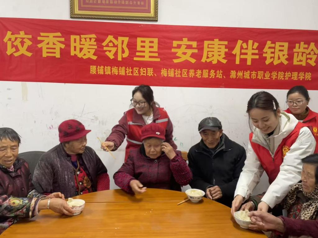为进一步弘扬中华民族尊老、爱老、助老的传统美德,增进社区邻里间的情感交流,12月17日,梅铺社区携手滁州城市职业学院护理学院,在梅铺社区养老服务站及梅铺居民组农家庭院,共同开展了 “饺香暖邻里,安康伴银龄” 主题活动,用热腾腾的饺子和专业的健康服务,为辖区高龄老人送去冬日里的温暖与关怀。