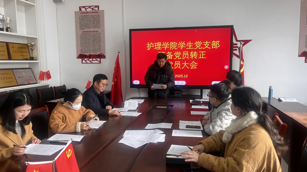 为严格党员发展程序,筑牢党员队伍建设根基,2025年12月25日,滁州城市职业学院护理学院学生党支部在党员活动室召开预备党员转正大会,专题讨论并表决陈轲莹、朱小萌、陈骥远三位同志的转正事宜。支部书记王艳主持会议,10名教师正式党员、5名学生正式党员悉数参会,三位预备党员到场接受考察。
