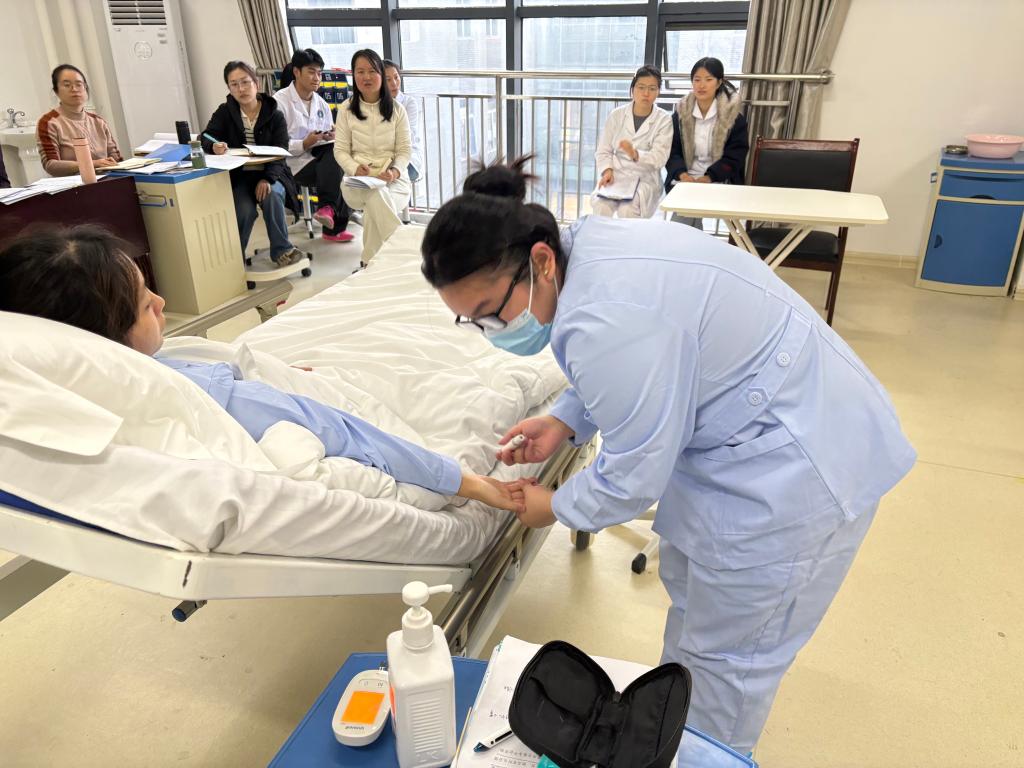 实训场地内,模拟病床旁的参赛学生身着淡蓝色服装,正专注完成测血糖操作:先是俯身与扮演 “患者” 的同学轻声沟通,确认信息后规范消毒皮肤,随后精准进针,整套流程既兼顾了操作的专业性,又融入了人文关怀的细节。而在场地一侧的观摩区,健康管理系的教师们人手一份省赛评分细则,时而标注学生的操作节奏,每一个细微之处都成为打磨技能的重点。