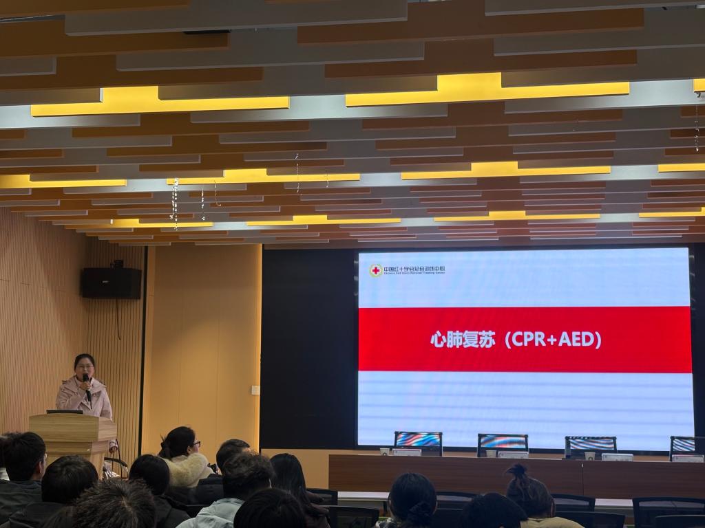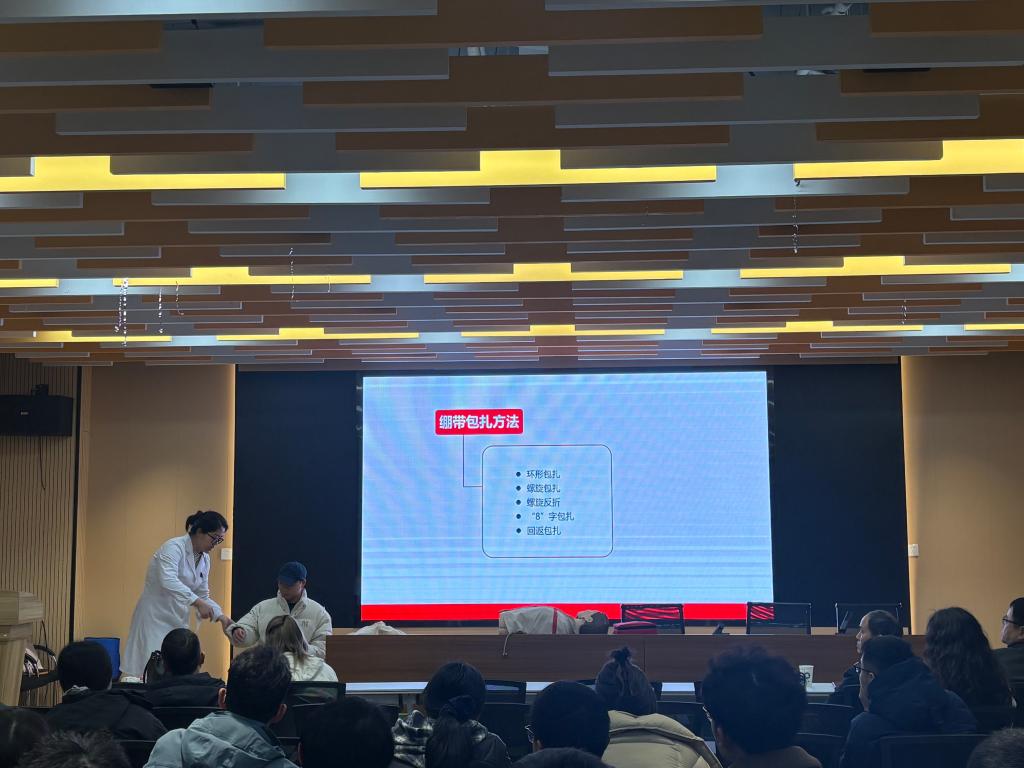 本次培训由护理学院沐菊老师、谢晓韵老师主讲,围绕心肺复苏(CPR+AED)与创伤急救包扎两大核心内容展开。两位讲师通过理论授课、现场演示与实操演练相结合的方式,系统讲解了急救流程、操作规范与注意事项。在实操环节,参训师生在专家指导下,利用模拟人逐一完成心肺复苏按压、AED 使用及绷带环形、螺旋、“8”字等包扎方法的练习,切实掌握了应急救护的核心技能。