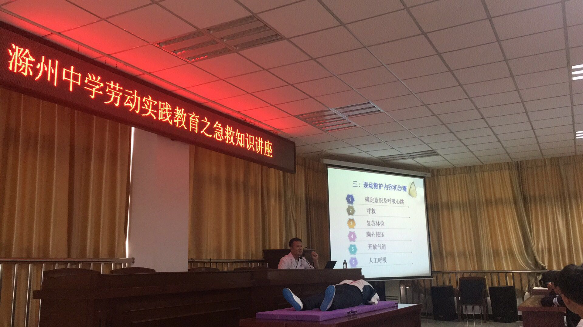 6月20下午,护理系党总支书记蔡季秋带领总支党员走进滁州中学开展急救知识培训,约200名滁州中学同学参加培训。