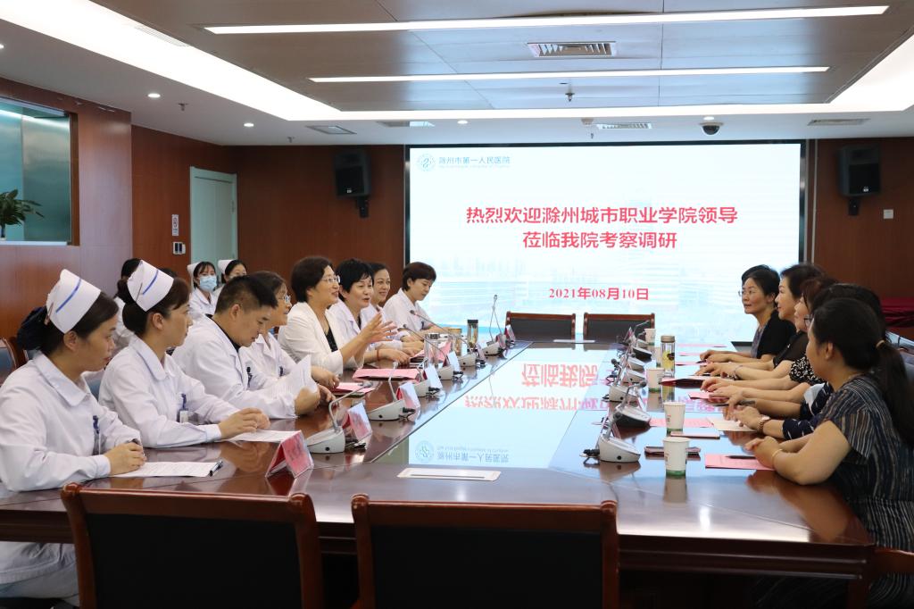 为深入贯彻落实《国家职业教育改革实施方案》和《职业教育提质培优行动计划(2020-2023)》,推进我院深化产教融合、校企合作,以及了解我院学生实习和就业情况,8月10日下午,院党委书记张志华带队赴滁州市第一人民医院走访调研。护理系党总支书记蔡季秋、副主任左晶晶,医学系党总支书记吴惠珍、主任毕璧等同志陪同调研。