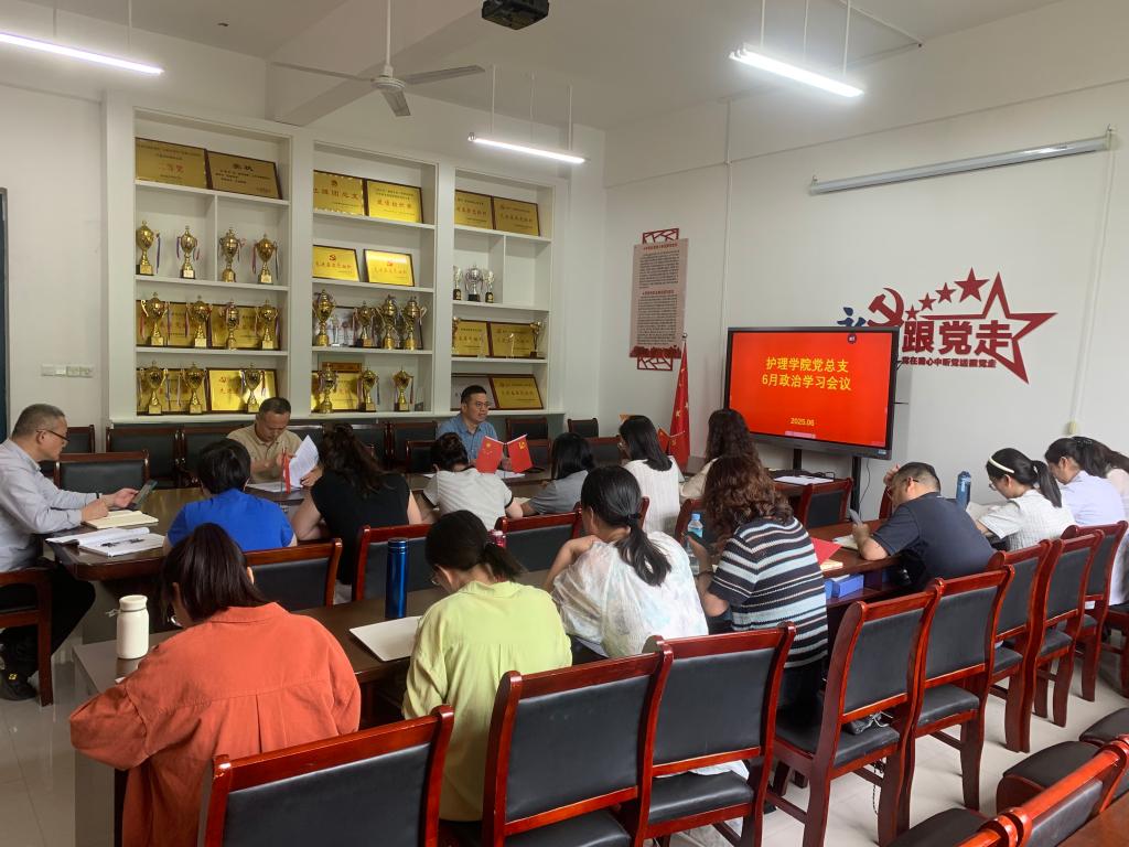 6月5日,护理学院党总支在仁德楼党员活动室召开6月政治学习会议,会上集中学习了习近平总书记的重要文章《加快建设教育强国》、《八项规定改变中国》、《党的十八大以来深入贯彻中央八项规定精神的成效和经验》等材料。会议由护理党总支书记席民主持,护理学院全体党员教师参会。