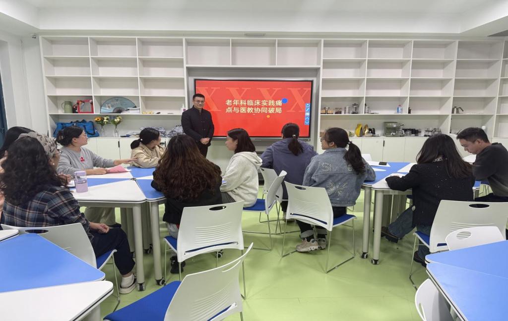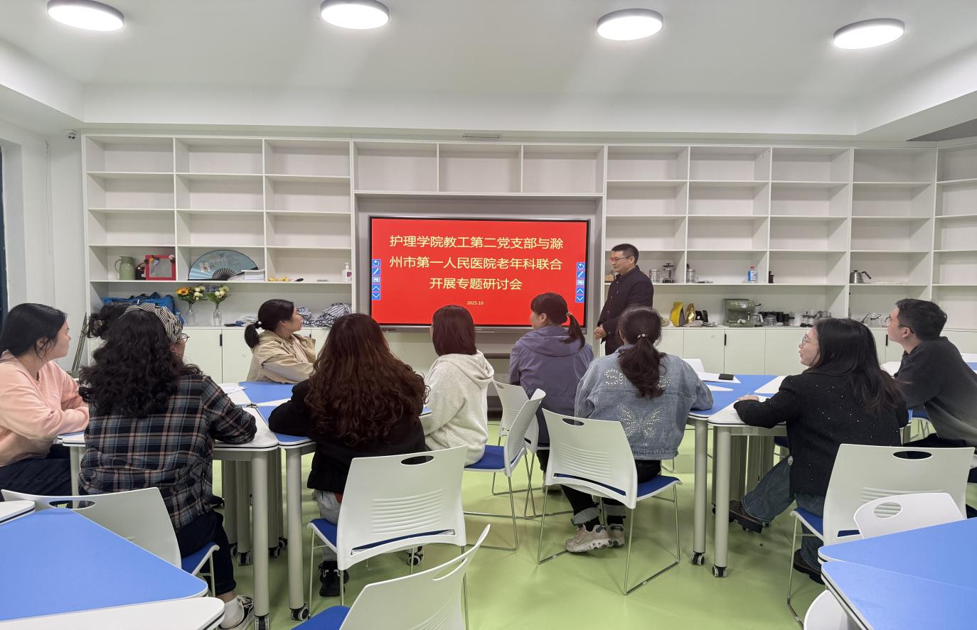 为深入贯彻落实党建引领下的医教协同发展理念,强化医疗机构与院校在老年护理领域的资源整合与优势互补,提升老年护理人才培养质量与临床服务水平,2025年10月29日,护理学院教工第二党支部与滁州市第一人民医院老年科联合举办“党建 + 医教协同”专题研讨会。