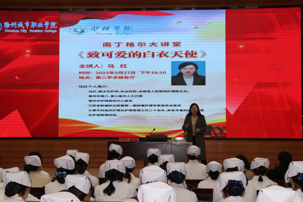 结合护理学院专业特性,开展劳动教育,培根铸魂。邀请全椒县人民医院护理部主任马红做了主题为《致敬可爱的白衣天使》专题讲座。讲座立足专业角度,从医院概况、科室设置、护理工作开展情况、疫情防控工作四个方面,深度阐释“白衣天使”的岗位责任与劳动价值,结合马红主任亲身抗疫经历,深化劳动教育内涵。