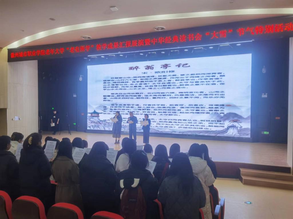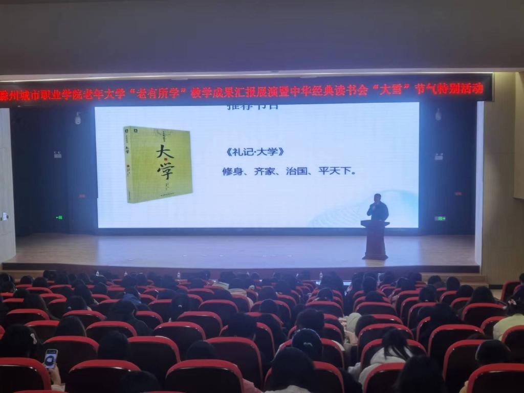 为充分展示我校老年大学学员风采,同时弘扬中华优秀传统文化,推进“书香校园”建设,培养青年学生的阅读习惯,在学校形成爱读书、读好书、想读书的浓厚氛围,12月7日下午,在我国传统的二十四节气—“大雪”节气来临之际,宣传统战部、继续教育学院、团委共同举办校老年大学“老有所学”教学成果汇报展演暨中华经典读书会“大雪”节气特别活动。校党委委员、校老年大学校长施向阳,校党委委员、宣传统战部部长陈通,校老年大学常务副校长、继续教育学院院长许梅,团委书记陈婷婷以及中华经典读书会近400名会员参加了活动。
