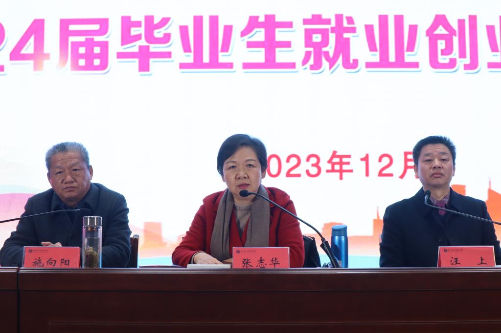 为深入贯彻党的二十大精神,落实党中央、国务院“稳就业”“保就业”决策部署,全力以赴促进2024届毕业生更加充分更高质量就业。12月20日下午,学校召开2023届毕业生就业创业工作总结暨2024届毕业生就业创业工作启动会。党委书记张志华出席会议并讲话。党委副书记、校长汪上主持会议。校领导施向阳、曹士东、吴惠珍、陈通、杨如江、高国柱参加会议。