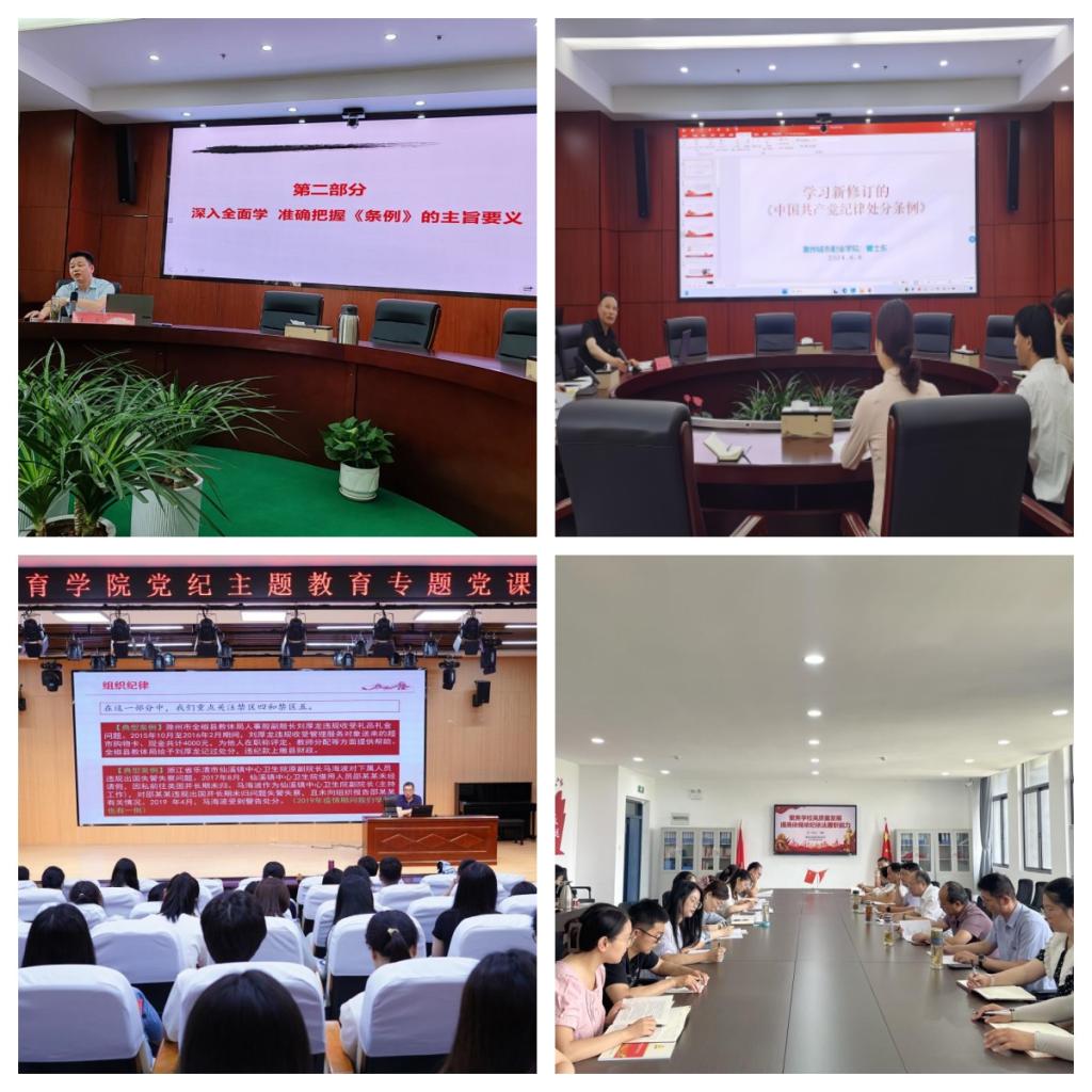 结合党纪学习教育,7名校领导班子成员和37名基层党组织书记带头讲纪律党课。党课围绕全面加强党的纪律建设要求,与学习贯彻习近平总书记关于党的纪律建设的重要论述要求结合,与学习贯彻党章党规结合,从严守党的纪律的重要性、违反党的纪律的危害以及如何严于律己、担当时代责任等方面,带领师生党员全面深入系统学习新修订的《中国共产党纪律处分条例》,特别是认真研读“六大纪律”重要内容,引导师生党员加深对党规党纪的认知,自觉做《条例》的主动学习者、坚定执行者、忠实捍卫者。