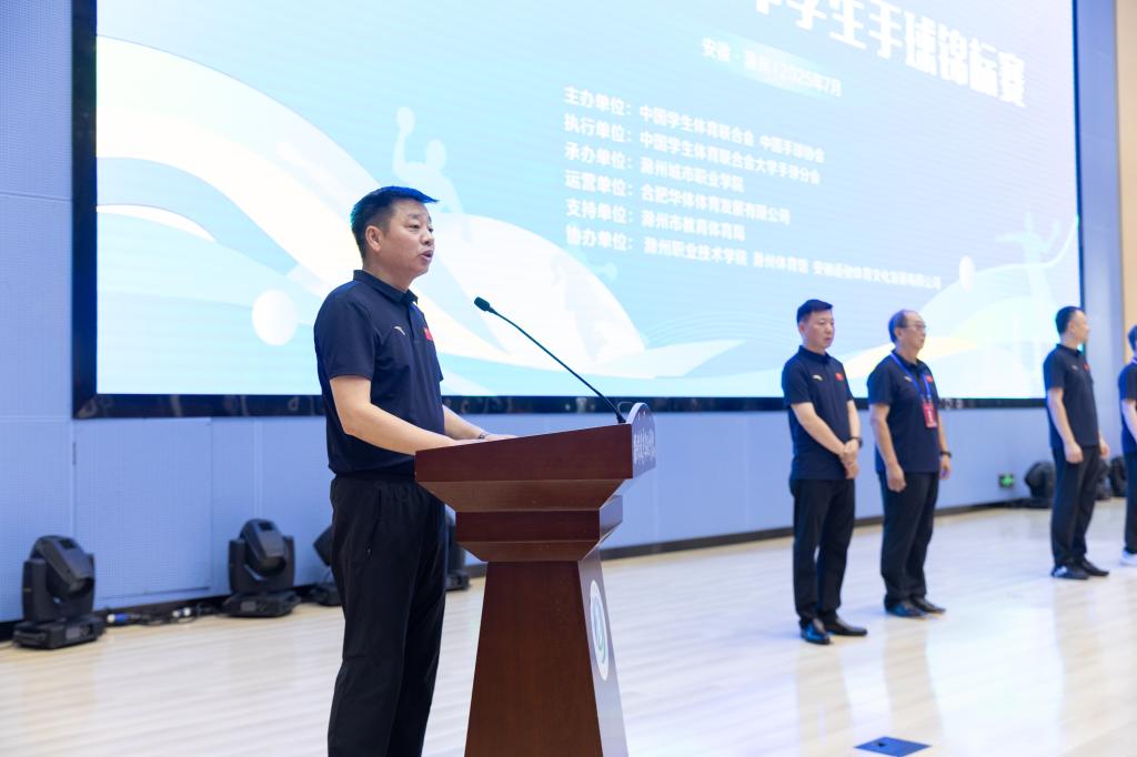 滁州城市职业学院党委书记王燕永致辞,他表示,学校一直致力于体育事业的发展,特别是手球运动。学校积极推广手球文化,开设手球选修课,组建专业手球队伍,建设专业场地,近年来在各类比赛中屡获佳绩,为滁州手球事业的发展做出了积极贡献。他强调,此次承办锦标赛,既是对学校体育工作的肯定,也是学习、交流、提升的一次宝贵机会,学校将全力做好赛事服务和保障工作,确保比赛顺利进行。