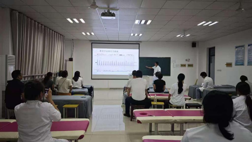 中医推拿班设于尚知楼205中医康复实训室,苏伟老师围绕肩颈放松、腰背保健等实用技法展开教学,通过人体模型演示与一对一指导,帮助学员掌握穴位定位与推拿力度,不少学员表示“学会这些技法,既能给自己放松,也能照顾家人,非常实用”。