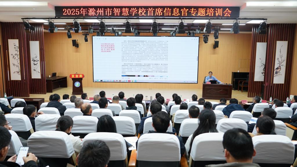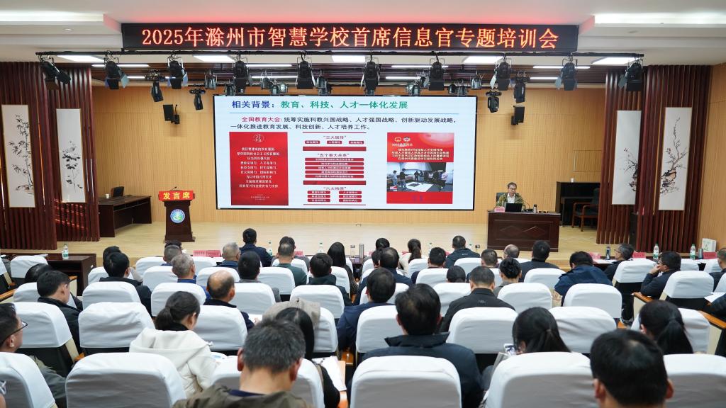 为深入贯彻落实国家教育数字化战略行动部署,加快推进滁州市智慧教育建设,12月1日,由滁州市教育体育局主办、教育学院承办的2025年滁州市智慧学校首席信息官专题培训会在教育学院报告厅顺利开班。校党委副书记、校长汪上出席开班式并致辞,市委教体工委委员、市教体局副局长都兰·沙格尼西出席并作培训动员讲话,来自全市各县(市、区)的中小学校长、首席信息官等教育信息化骨干,我校各二级学院相关负责人参加本次培训。