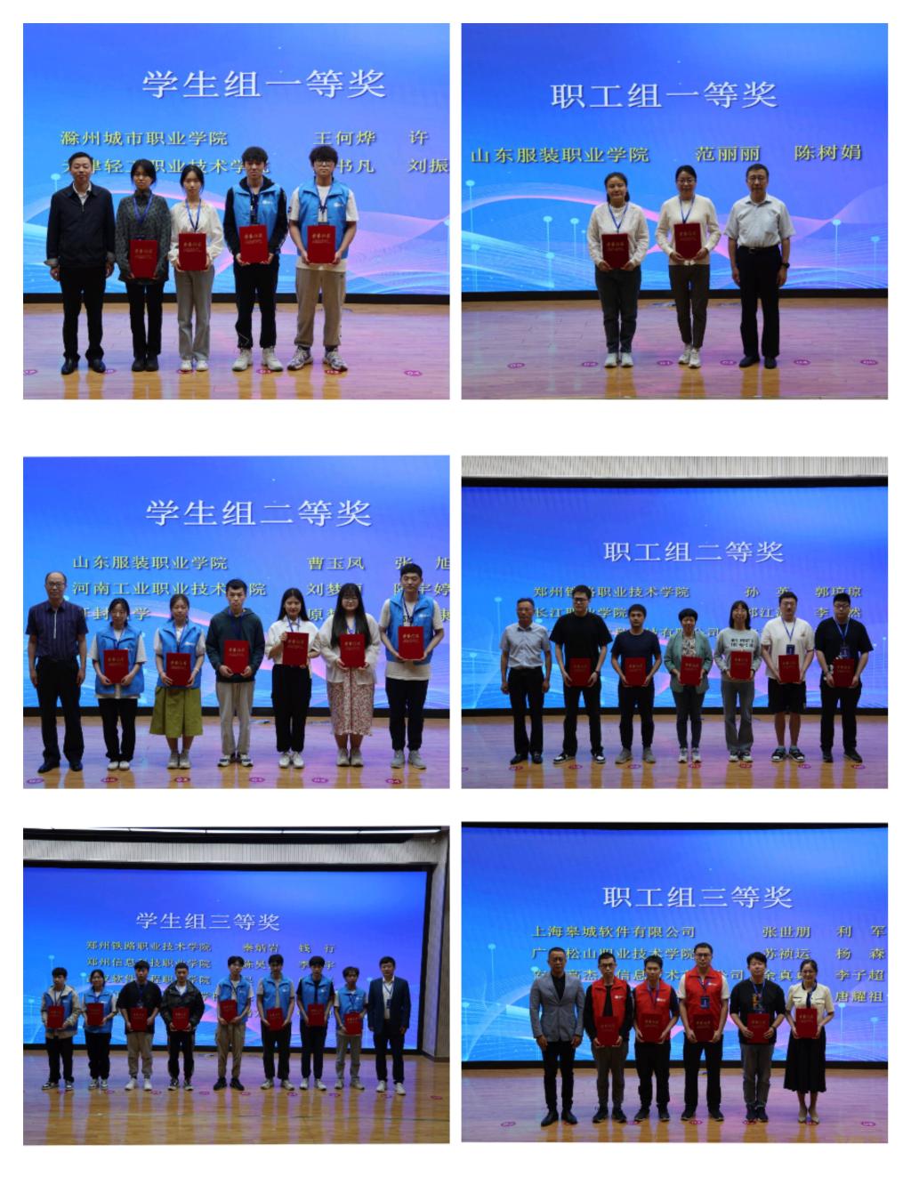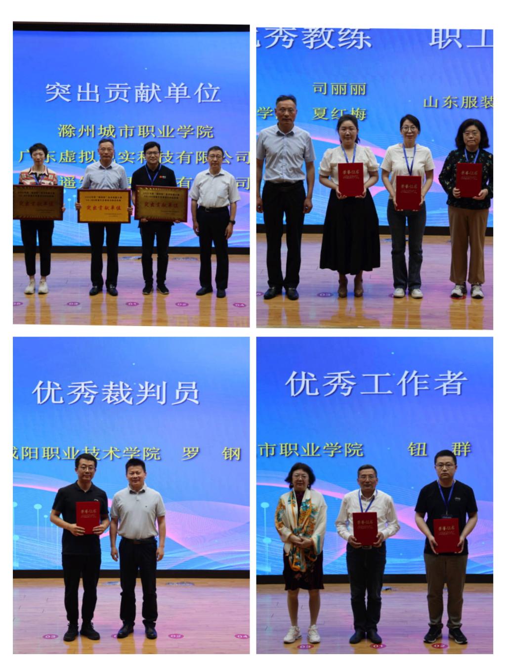 大赛裁判长、南京信息职业技术学院院长徐绕山宣布大赛成绩。山东服装职业学院职工代表队、滁州城市职业学院、天津轻工职业技术学院学生代表队分获职工组、学生组一等奖,我校司丽丽老师、天津轻工职业技术学院夏红梅老师获评学生组优秀教练,山东服装职业学院王凌云获评职工组优秀教练,咸阳职业技术学院罗钢老师获评大赛优秀裁判员,我校钮群、王轶获评大赛优秀工作者,滁州城市职业学院、广东虚拟现实科技有限公司、上海遥知信息技术有限公司获评本次大赛突出贡献单位。