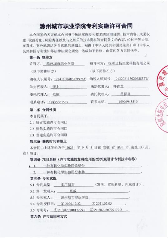 近日,我校医学院范威博士积极与企业开展合作并取得突破性进展,其两项实用新型专利以“专利实施许可”的形式授权给徐州达杨生化科技有限公司使用,实现了我校第一例科技成果转化。