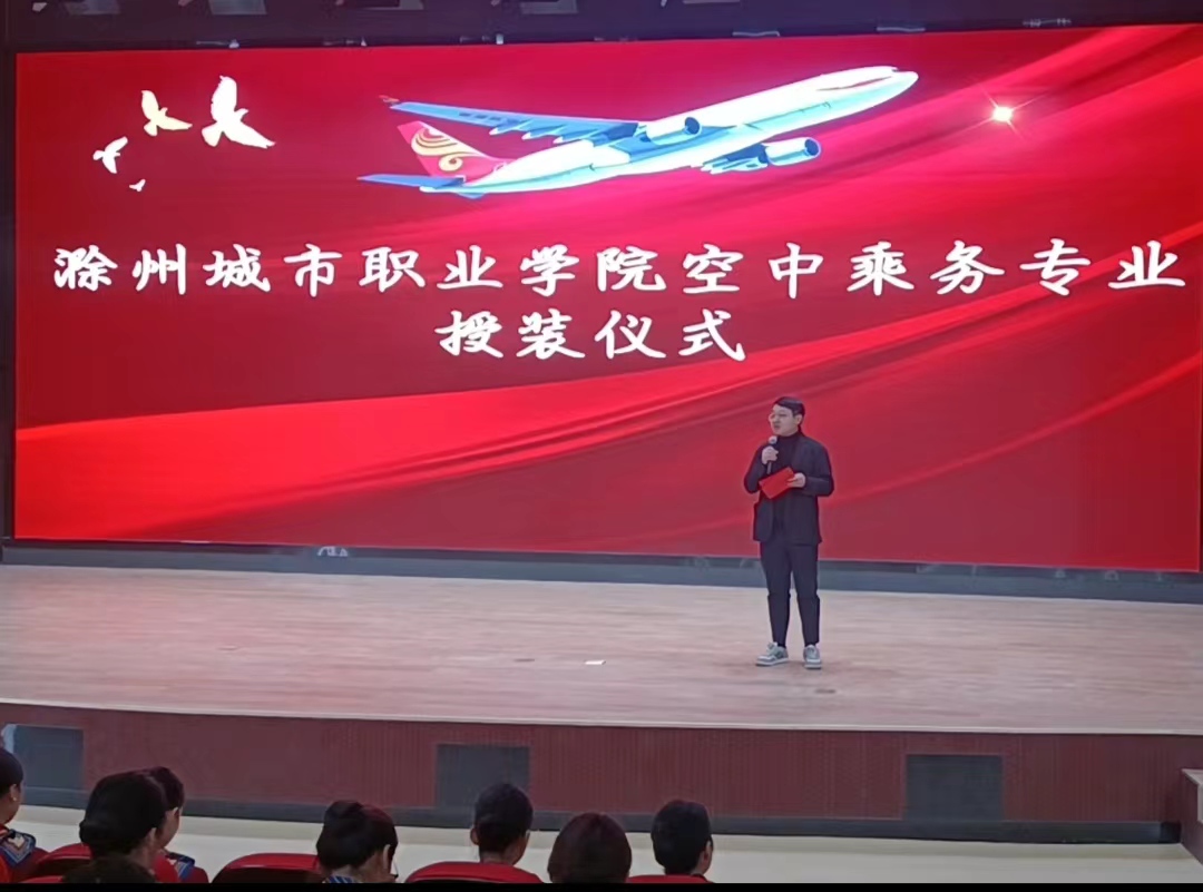 授装仪式在嘹亮的国歌声中拉开帷幕。滁州城市职业学院党委委员施向阳致辞。施向阳对2023级空中乘务专业同学的精神面貌、专业知识给予了高度的肯定,鼓励同学们守护制服荣誉感,并勉励同学们要有忠诚担当的政治品格、严谨科学的专业精神、团结协作的工作作风和敬业奉献的职业操守。“在大学时光里用积极的行动去努力拼搏,在‘民航强国’的战略背景下为未来民航事业的发展贡献自己的青春与智慧。”