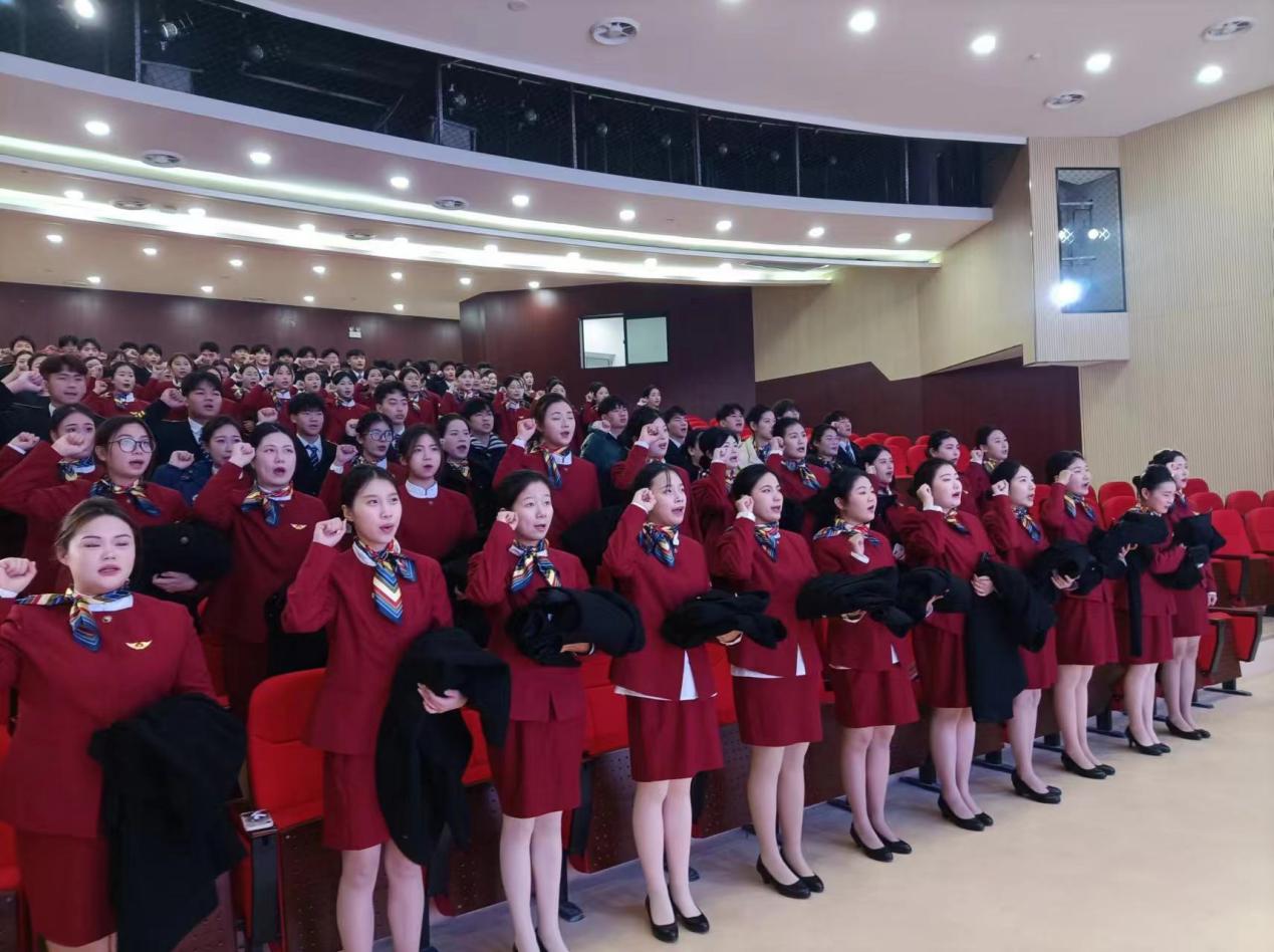 同学们整装肃立,高举右手宣誓:“我是滁州城市职业学院空中乘务专业的学生,是未来从事航空服务事业的工作人员,遵守滁州城市职业学院校规,遵守空中乘务专业行为规范,履行学生的职责和义务,心存敬畏,满怀感激,坚定航空服务工作信念,牢记我是民航人,践行民航精神,认真学习,严谨锤炼,时刻准备着,为民航事业贡献自己的智慧与力量。无愧于学校!无愧于民航事业!无愧青春!”
