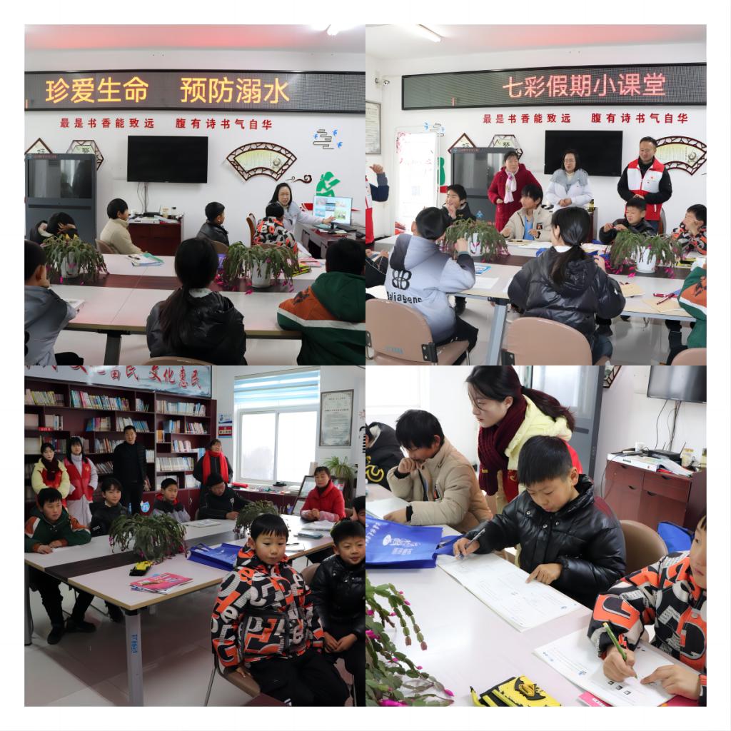 在大季村农家书屋,师生们带来了丰富多彩的课程和活动。他们为孩子们辅导寒假作业,组织绘画课、手工制作课等丰富多样的小课堂,让孩子们在快乐互动的氛围中探索、学习和成长。同时,为孩子们开展了防溺水教育,普及溺水的危害、预防措施以及发生溺水事故后的自救和救援方法。着重强调了不要在非游泳区游泳、不要单独行动、注意水质安全等预防溺水的注意事项。