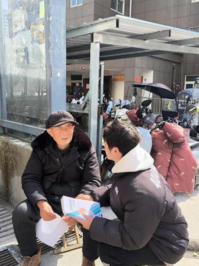 图为韩秋月同学向老人宣传春季传染病预防措施