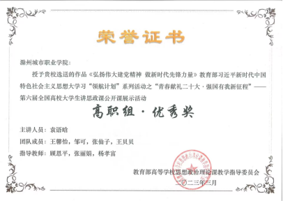 在安徽省首届大学生讲思政课公开课展示活动获片区赛三等奖1项;在教育部“领航计划”第六届全国大学生讲思政课公开课展示活动中,荣获高职组二等奖1项,优秀奖1项;在安徽省第二届大学生讲思政课片区赛中获二等奖1项,三等奖两项。苏欣同学代表我校参加由中共安徽省委教育工委主办的安徽省第二届大学生讲思政课展示活动高职组决赛荣获一等奖!