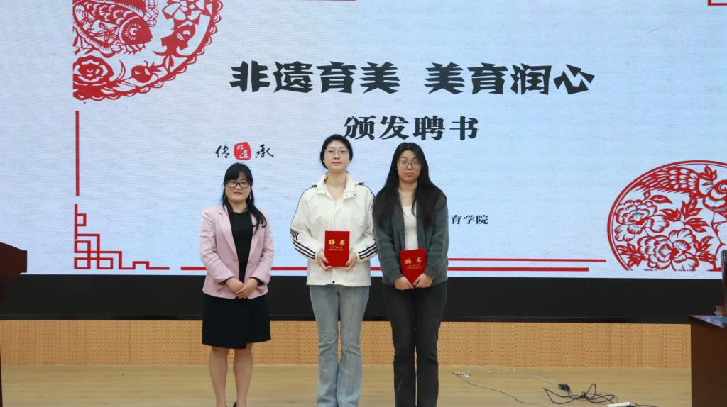 启动仪式环节,袁远为参与项目的师生成员们介绍了“非遗剪纸”项目的项目概况,其中包含项目成立背景、总体目标、组织架构及活动形式等内容。随后,邀请陈海珍作为本项目的校外指导专家为学生负责人颁发聘书。