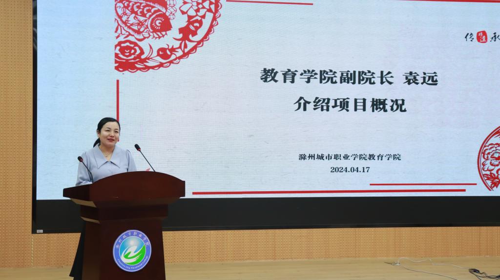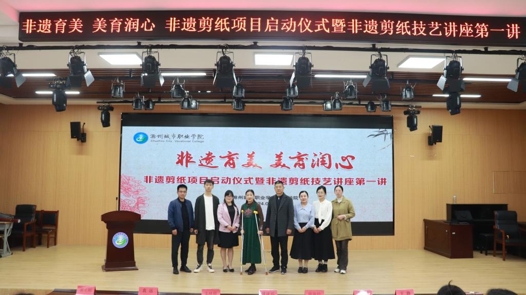 为弘扬中华优秀传统文化,感悟非物质文化遗产魅力,促进以美育人、以文化人,打造以“剪纸”为特色课程,具有厚重传统文化底蕴的“树人”品牌活动,4月18日下午,由校工会与教育学院联合主办的“非遗育美,美育润心”非遗剪纸项目启动仪式暨非遗剪纸技艺讲座第一讲在C2北1102报告厅隆重举行。活动特邀省级非遗剪纸传承人朱咏梅作专题讲座,校工会委员会主席钱庆兵,非遗凤画市级传承人、安徽滁州技师学院副教授陈海珍,教育学院副院长袁远,教育学院团总支书记黄正顺等出席活动。