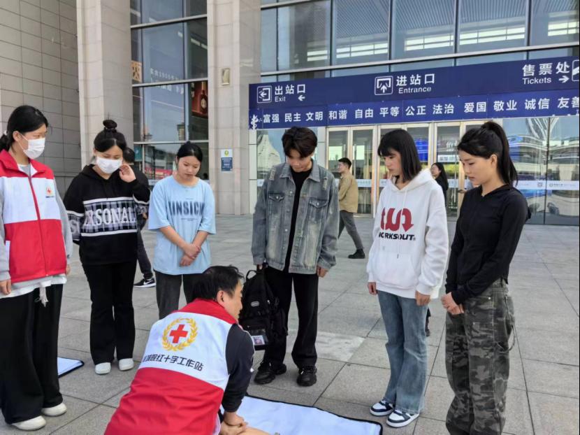 在滁州高铁站站前广场,护理专业志愿者身着整齐的志愿者服装,面带微笑,向过往的旅客发放应急救护宣传资料,并耐心地向他们讲解基本的急救知识和技能。志愿者现场演示了心肺复苏、止血包扎等实用技能。旅客纷纷驻足,踊跃参与,专心致志地聆听志愿者的讲解,认真学习急救知识。旅客张女士满怀感慨地说:“此次来滁旅行,我收获颇丰。在高铁站偶遇了护理学院师生的急救志愿服务活动,我不仅学到了实用的急救知识,更深刻地感受到了他们的专业与热情。