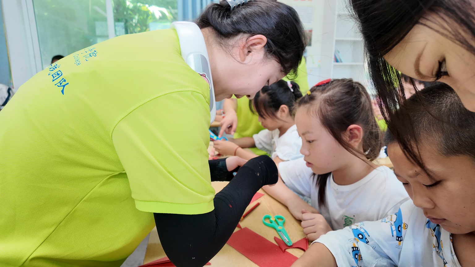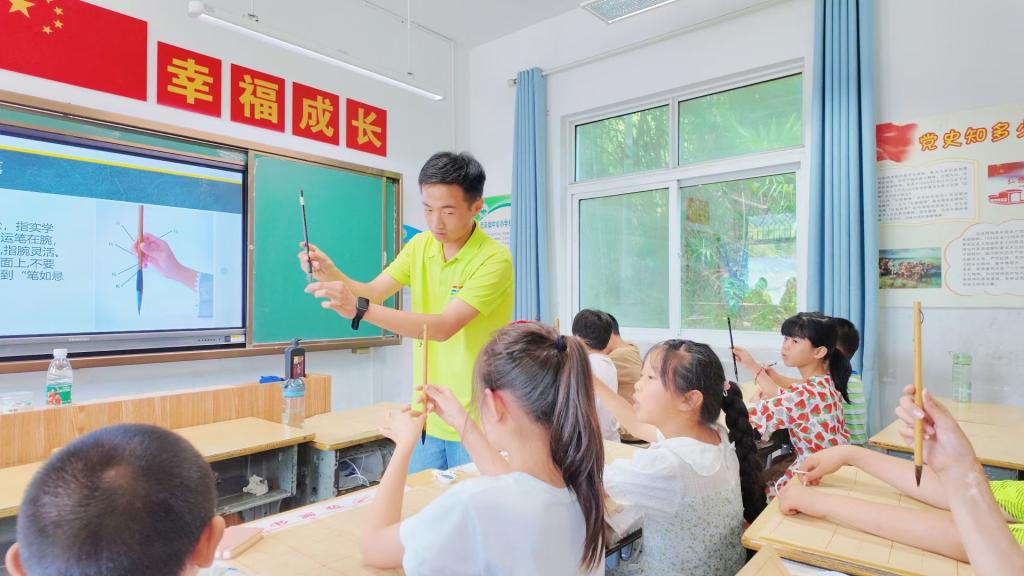 实践团成员们还发挥专业所长,走进了陈岭村中心小学,开展了书法、剪纸、音乐、机器人编程等丰富多样的“七彩假期”课堂,为当地小朋友带来了一场别开生面的文化盛宴。在非遗传承讲解中,师生们耐心地教导小朋友剪纸、书法等传统技艺,让孩子们领略到中华传统文化的博大精深。同时,机器人编程课程则为小朋友们打开了科技的新大门,激发了他们对创新与探索的热情。