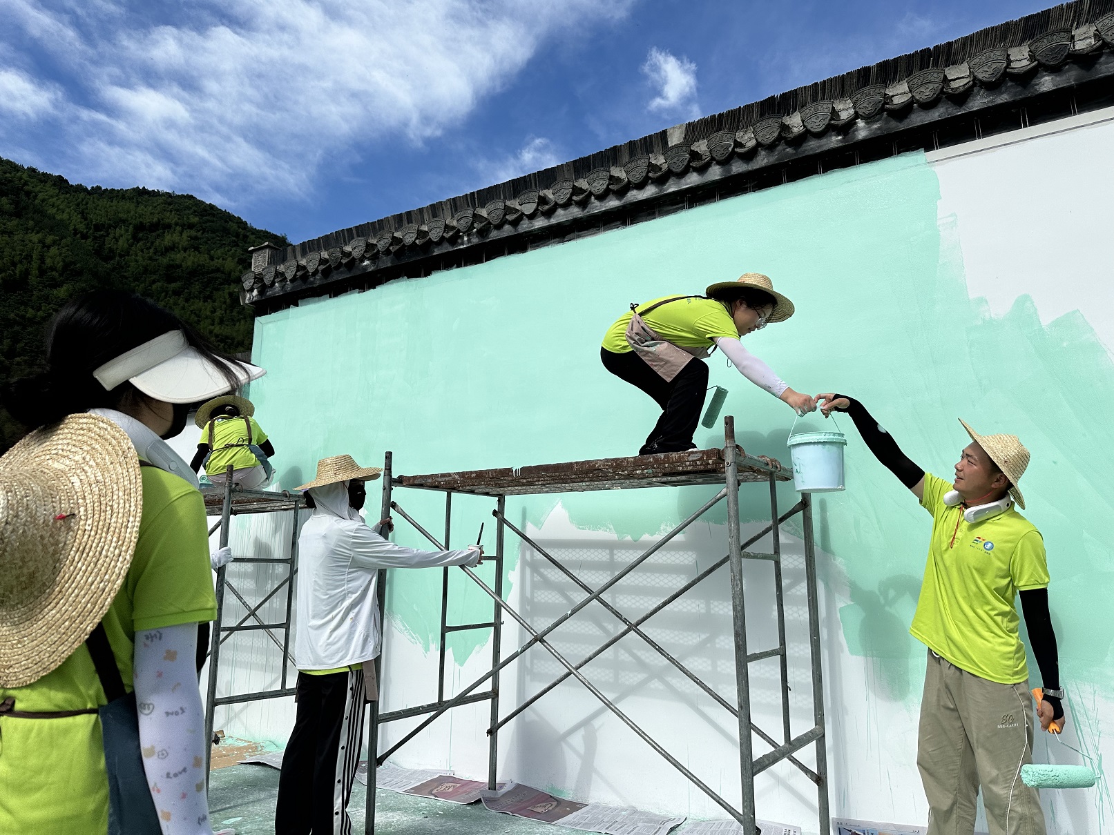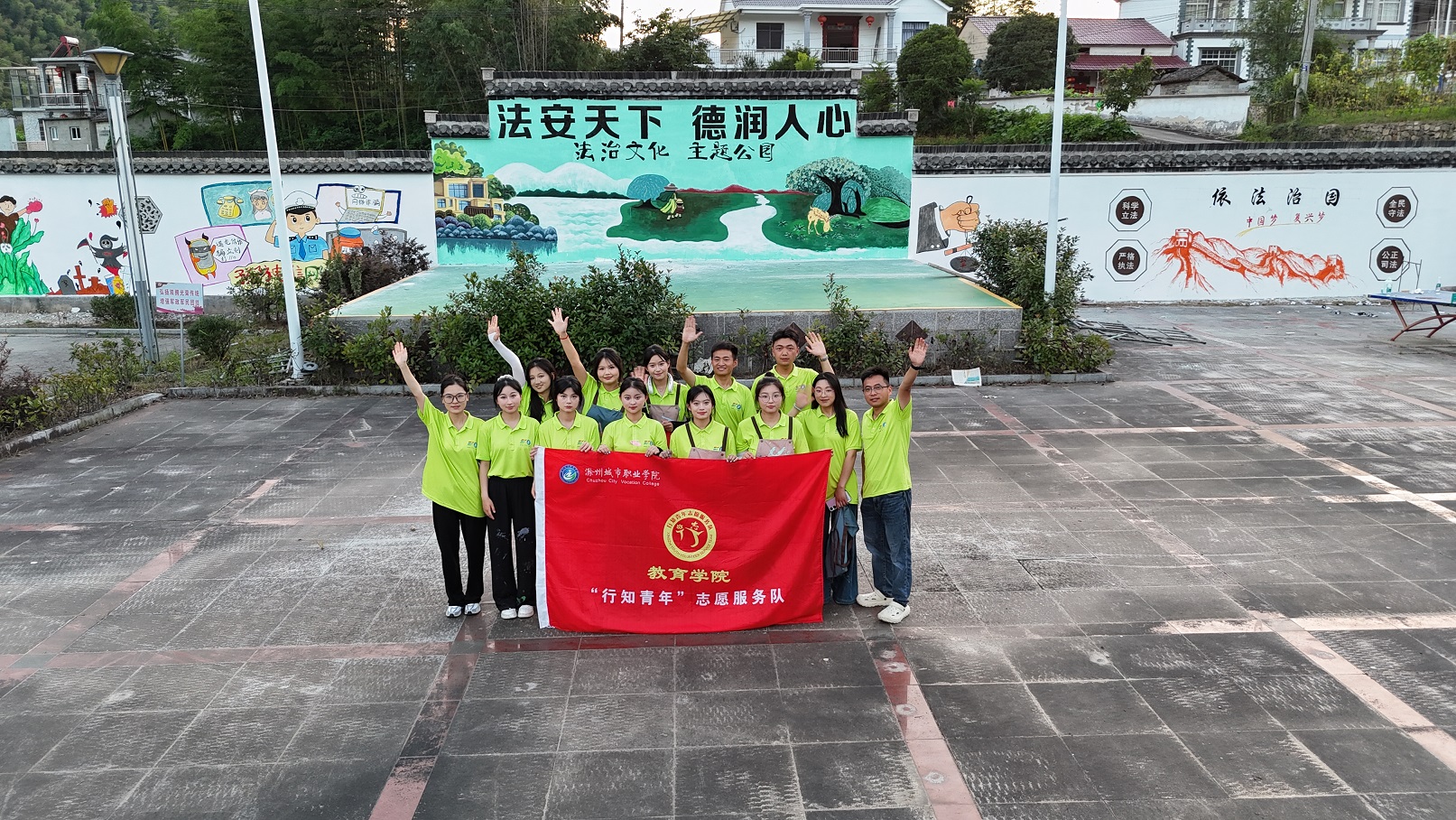 活动中,师生们齐心协力,不惧炎热,在高温下连续工作一周,用手中的画笔在宣城旌德县云乐镇法治广场留下了一幅幅精美的法治宣传墙绘。这些墙绘内容丰富多样,涵盖了宪法知识、法治案例、法律援助等多个方面。通过生动形象的画面和简洁明了的文字,将严肃的法治主题以通俗易懂、引人入胜的方式呈现出来。最终完成了5幅墙面、近300平的墙绘制作,描绘出了一幅完整的法治“长卷”,得到了当地政府和村民的高度认可。