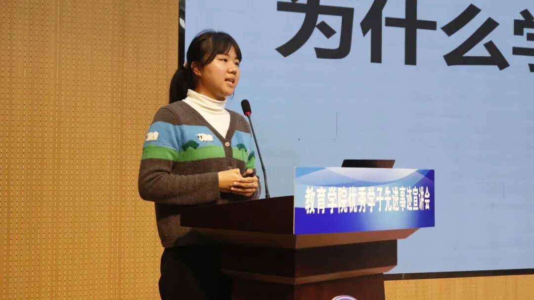 优秀学子先进事迹宣讲团成员由教育学院推选出的6位国家奖学金、国家励志奖学金获奖学生代表组成。他们是教育学院的康彦彦、韩兴国、王旭、张思娜、石文卉和张明雨竹。宣讲会上,优秀学子们陆续登场,结合个人成长历程,用朴实真挚的话语,围绕专业学习、学科竞赛、社团实践、公益服务等维度分享了他们在成长路上的鲜活故事,与在场同学面对面聊方法、聊瓶颈、聊蜕变、聊感悟,鼓励大家锚定清晰的成长方向,培养自律的生活节奏,不畏挑战、敢于突破自我。优秀学子们的走心分享,让现场同学真切触摸到了拼搏的温度,也进一步坚定了自己的前进方向。 六位学子用真诚的语言、鲜活的案例,让在场同学感受到了“努力可及、优秀可学”的力量。