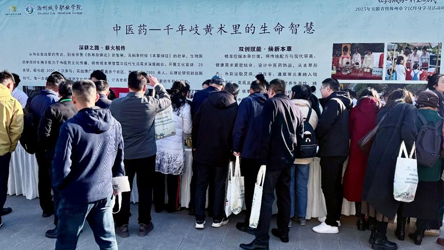 为推动全民终身学习理念落地生根,11月18日上午,“2025年安徽省暨滁州市全民终身学习活动周开幕式”在我校隆重举行,我院师生精心策划并承办了“中医药文化宣传展台”,以一系列“可感知、能互动、乐分享”的创意形式,向广大市民和与会代表展示中医药文化的独特魅力,成为现场最具人气的展区之一。