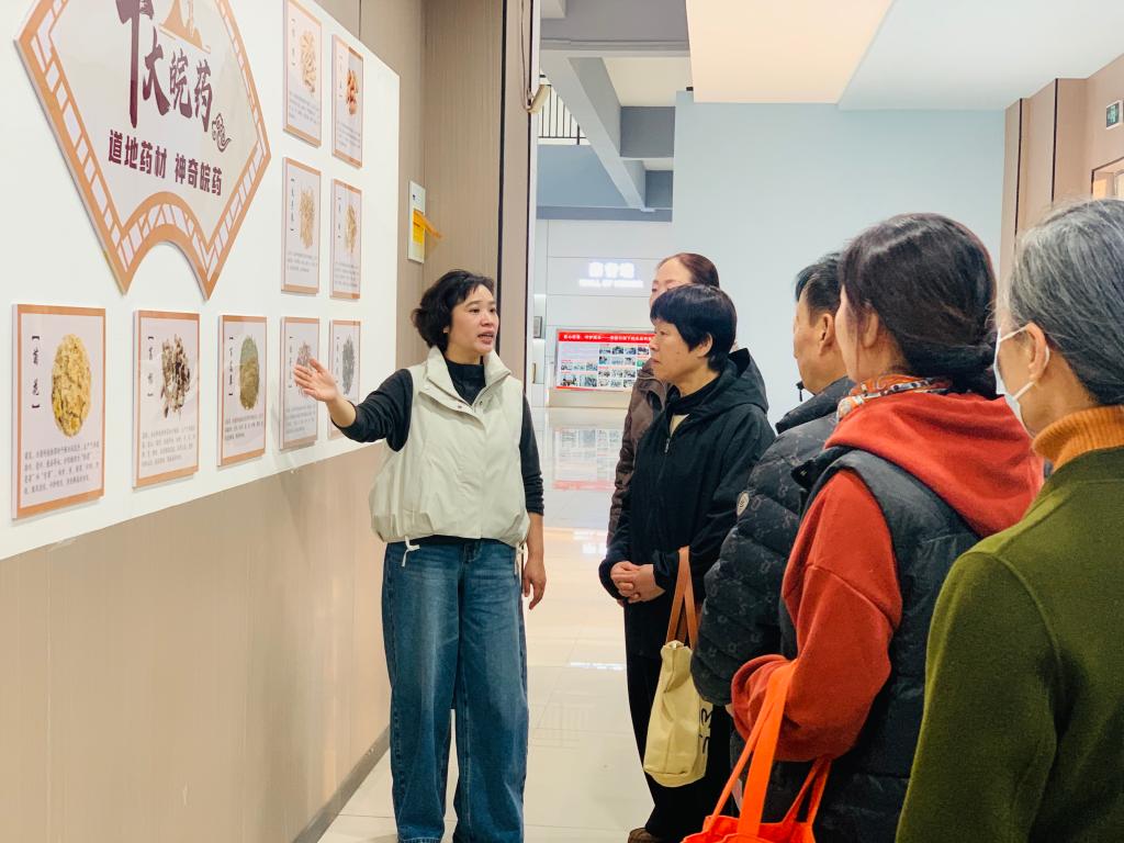 在老师的引导下,居民们参观了生物医药学院中医药展厅;徐旭老师系统介绍了展厅内陈列的中药材标本、传统制药工具以及中医药发展历程,完整呈现了中医药文化的深厚底蕴与知识体系。居民们对各类中药材表现出浓厚兴趣,不时驻足询问。讲解时,徐旭结合老年人常见的健康问题,详细介绍了枸杞、黄芪、菊花等药材的性味功效,以及日常养生小窍门。大家纷纷表示,通过活动不仅学到了实用的养生知识,也感受到了传统中医药文化的独特魅力。