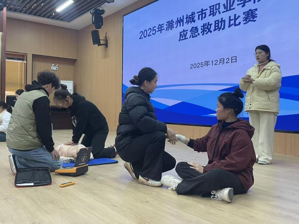 比赛紧扣校园及生活常见应急场景,设置“实操技能比拼”“情景模拟处置”两大核心环节。实操环节中,队员们默契配合,依次完成心肺复苏(CPR)+AED操作、创伤止血包扎、骨折固定、气道异物梗阻急救等项目,按压深度精准、包扎手法规范,展现出扎实的实操功底;情景模拟环节聚焦校园踩踏、运动损伤、意外溺水等真实场景,各队伍快速评估、科学分工,从现场警戒、伤情判断到规范施救,完整呈现应急处置全流程,生动还原了紧急状态下的救援现场。