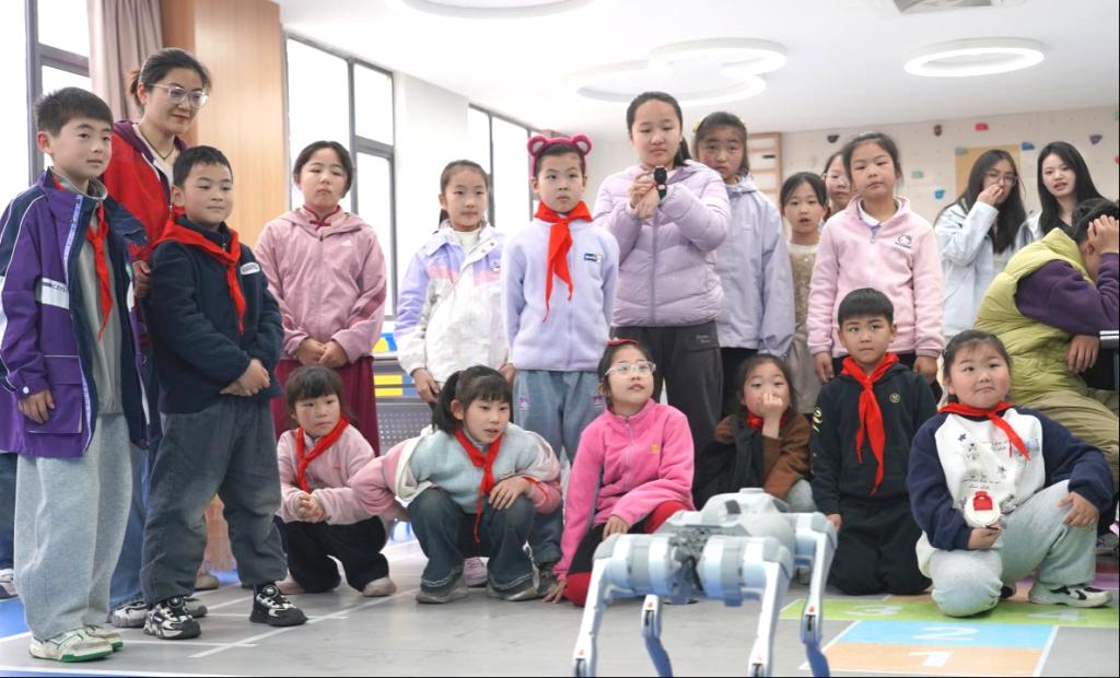 研学第一站,同学们来到数智教育研创中心,近距离感受智能科技带来的新奇体验。中心主任张凯为大家讲解机器人相关知识,并现场演示智能交互、指令操控等内容,活泼有趣的展示瞬间吸引了大家的目光。同学们踊跃参与互动,有的轻轻与机器狗“握手”,有的试着发出指令,看它灵活行走、转身、跳跃,现场氛围有序且热烈。