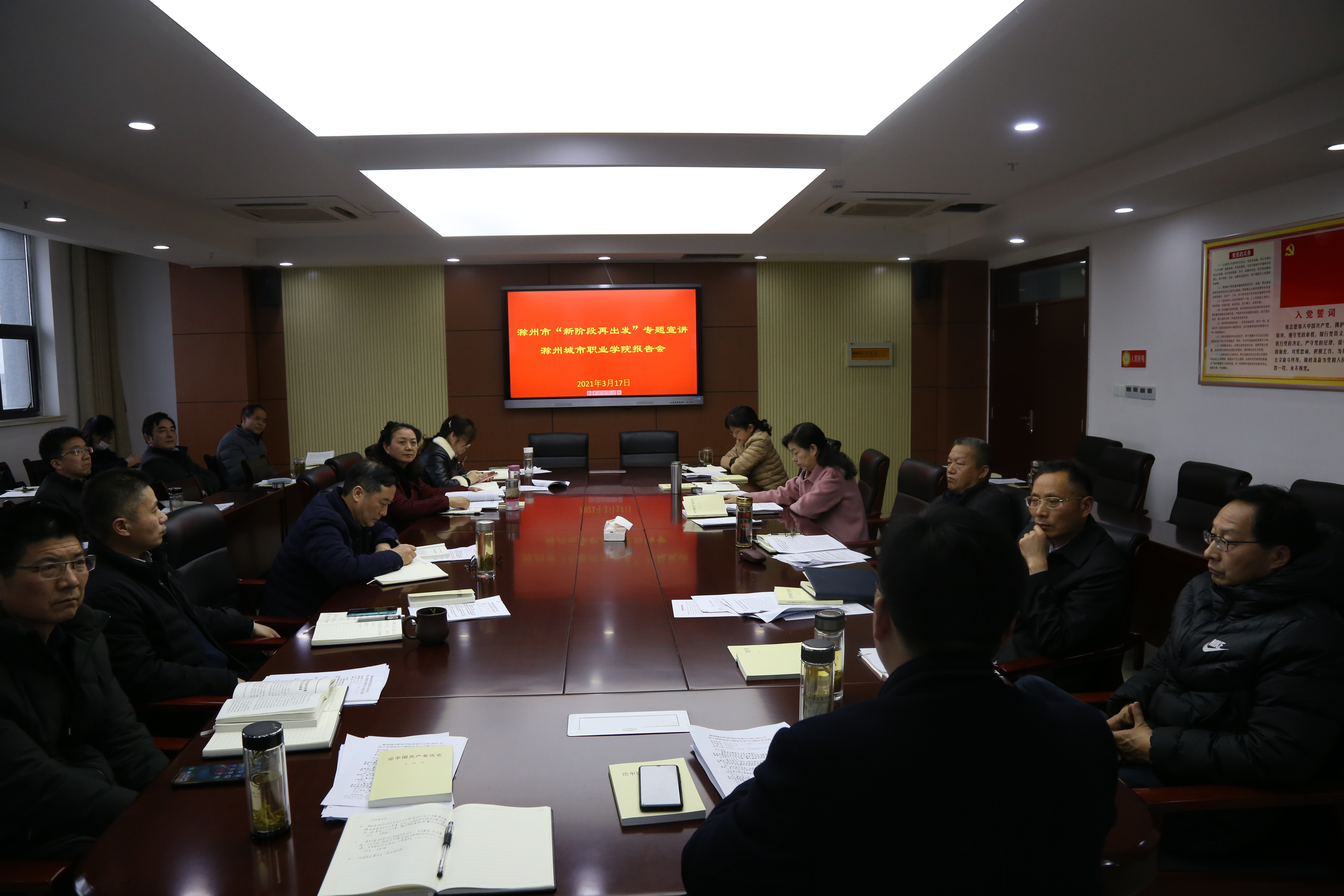 集中学习结束后,陈通同志作滁州市“新阶段再出发”专题宣讲。陈通传达了全市“新阶段再出发”动员大会精神,回顾了“十三五”以来滁州市经济社会发展取得的历史性成就,并围绕“三问”“四破”“五再”“三保障”,分享了对“新阶段再出发”的理解认识和思考感受。与会人员一致表示,将以此次宣讲活动为新的出发点,进一步深入学习领会全市“新阶段再出发”动员大会精神实质,把贯彻落实全市“新阶段再出发”动员大会精神与开展党史学习教育结合起来,立足岗位职能,忠诚履职担当,坚持以习近平新时代中国特色社会主义思想为指引,把握新发展阶段、贯彻新发展理念、构建新发展格局,以更加饱满的状态、更加务实的作风、更加创新的举措,推动学院技能型高水平大学建设,为新阶段现代化新滁州建设作出新的更大贡献。
