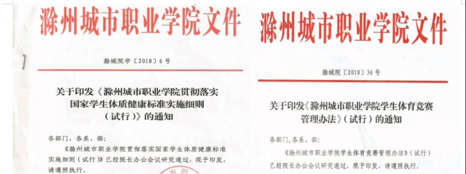 完成《滁州城市职业学院体育竞赛管理办法》和《滁州城市职业学院贯彻落实国家学生体质健康标准实施细则》的制定,推进《体育课教学管理规定》、《体育教师岗位职责》、《体育器材室管理规定》制度上墙,加快推进《体育教师教学质量考核办法》、《运动队管理办法》、《体育场馆管理实施办法》的出台,激励教师参与到体育教育教学的各个环节中来。