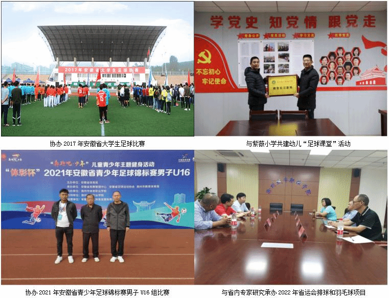 体育教学部先后协办2017年安徽省大学生足球比赛、2021年安徽省青少年足球锦标赛男子U16组比赛,参与滁州市紫薇小学共建幼儿“足球课堂”活动,增进幼儿足球教育交流,多名教师积极参与滁州市全民健身运动会、滁州市中小学田径运动、滁州市机关趣味运动会等比赛活动裁判工作,2022年省运会高校部排球和羽毛球项目由我院承办,目前正在积极筹备,努力为赛事提供有力保障。