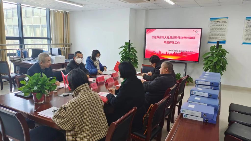 评估会在图文中心709举行。滁州城市职业学院继续教育学院院长许梅主持会议。市人社局职业能力建设科科长王华涛、滁州市人社局技能等级鉴定科胡闪闪、滁州职业技术学院继续教育学院职业培训认定科长吕波、滁州城市职业学院党委委员、校领导施向阳、继续教育学院副院长孟红军等成员参加评估会。