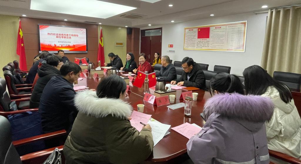 2月9日上午,淮南市委老干局副局长孙巍一行到我校考察交流老年大学工作,滁州市老教委副主任、市老年大学校长张尽忠、市老年大学副校长施芝华、市委老干局副局长余宝等陪同参加,校党委书记张志华、党委委员、校老年大学校长施向阳、继续教育学院院长、校老年大学常务副校长许梅、副院长孟红军出席会议。会议由施向阳主持。