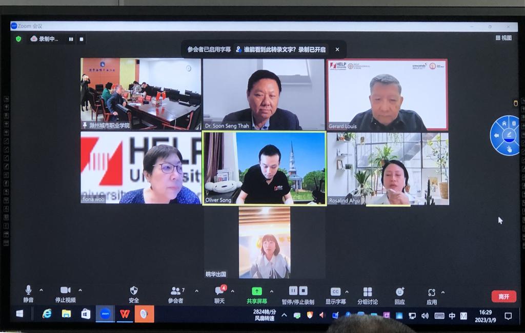 为助力我校高水平技能型大学建设,进一步提升我校国际合作办学的能力和水平,3月9日下午,在图文中心第二会议室举行我校与马来西亚精英大学线上合作办学项目交流会,马来西亚精英大学副校长兼行为科学、教育与语言学院院长Gerard Louis 博士、副校长胡玉凤、教育学系主任Thah 博士、学前教育大专课程主任、高级讲师Ms. Rosalind Ahju、精英大学中国区域代表宋崟升,我校党委委员施向阳、党委委员、副校长吴惠珍、党委委员、教育学院院长高国柱、继续教育学院院长许梅、学前教育专业负责人王李艳参加项目交流会。会议由精英大学中国区域代表宋崟升主持。