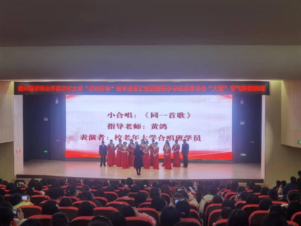 滁州城市职业学院老年大学自成立近两年来,经过校领导及师生的共同努力,今年校老年大学获得“滁州市老年教育示范学校”的荣誉称号;《坚持“三贴近 三体现”开展老有所学行动》案例在全国高校现代远程教育组主办的评选活动中荣获优秀案例奖并入选“中国老年教育优秀案例库”;校老年大学丰乐社区教学点成功当选为“2023年乡镇(街道)老年学校省级示范校”。为充分展示我校老年大学学员风采,同时弘扬中华优秀传统文化,推进“书香校园”建设,培养青年学生的阅读习惯,在学校形成爱读书、读好书、想读书的浓厚氛围,12月7日下午,在我国传统的二十四节气—“大雪”节气来临之际,宣传统战部、继续教育学院、团委共同举办校老年大学“老有所学”教学成果汇报展演暨中华经典读书会“大雪”节气特别活动。校党委委员、校老年大学校长施向阳,校党委委员、宣传统战部部长陈通,校老年大学常务副校长、继续教育学院院长许梅,团委书记陈婷婷以及中华经典读书会近400名会员参加了活动。