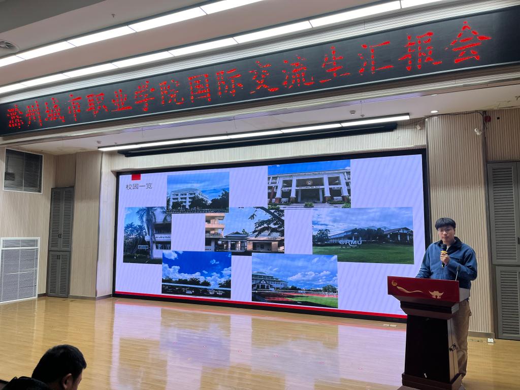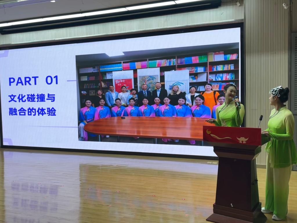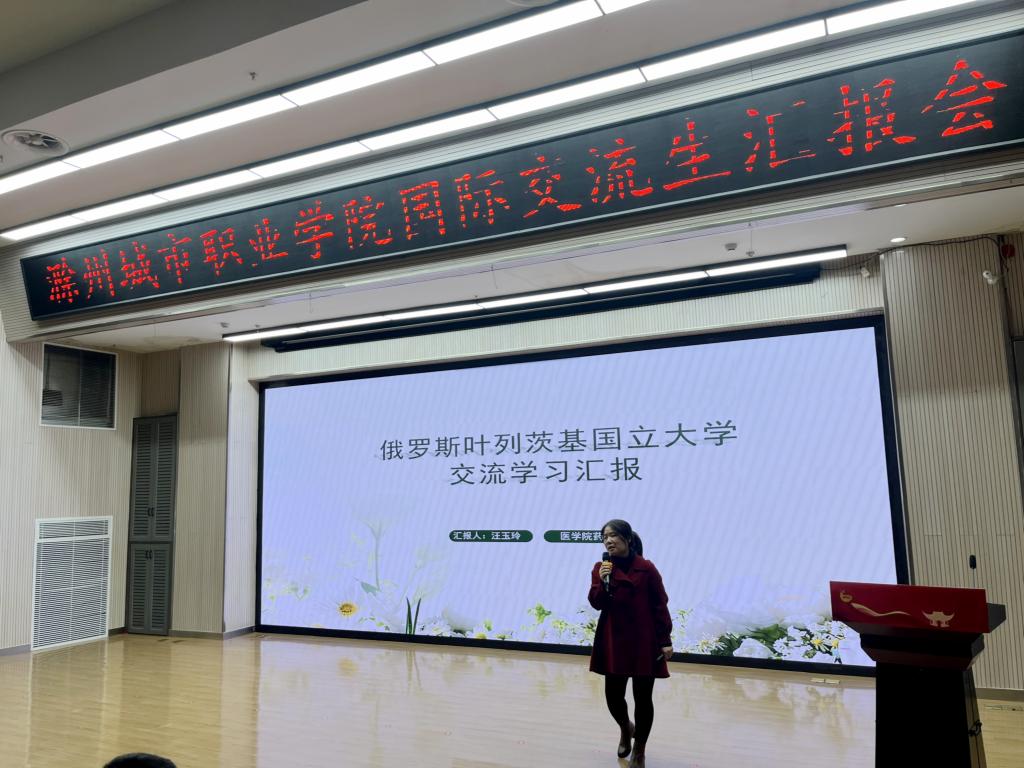 汇报会上,交流师生们依次走上讲台,分享他们在异国他乡的学习、生活点滴。王李艳首先分享她在泰国的交流学习感悟,希望学校今后能够加强中外合作交流来提升教师的国际视野,并强调了海外交流学习过程中提升英语沟通能力的重要性;汪玉玲声情并茂地讲述了她在国外一个月的学习和收获,她最大的收获是参加国外的专业课程学习及学术研讨会,国外的教学模式对于她回国后的教学有着很大的启发和帮助,希望此次交流学习能成为新起点,为促进国际交流与合作搭建更加坚实的桥梁;赴泰交流生代表、校学生会主席葛锐分享了他在泰国学习交流活动中的见闻与收获,不仅学习到了新的语言,感受到了不同国家的文化,还交流了专业知识,锻炼了能力;23早教高专3班杨文婕生动讲述了她在泰国传播中国文化的难忘经历,展现出跨文化交流的魅力与价值;护理学院学生会主席赵婕说俄罗斯高校的实践教学环节让她对专业知识有了更深入的理解与应用能力;23检验高专2班侯梦菲表示在国外她不仅学习到了丰富的专业知识,还和当地的学生建立的深厚的友谊;我校毕业生19药学初专班宗洺帆,通过赴俄一个月的交流学习,拓宽了自己的视野,回国后了解到我校和俄罗斯叶列茨基国立大学开展了本硕联合培养项目,今年6月毕业后,就前往俄罗斯攻读本硕留学项目。他精心制作一段视频,分享了他在俄罗斯留学期间的精彩瞬间;花鼓队员代表王小文和吴静分享了她们在俄罗斯进行文化交流期间的所见、所闻、所感,并表示今后会用更加饱满的热情和扎实的技艺,用非遗传统文化讲好中国故事。