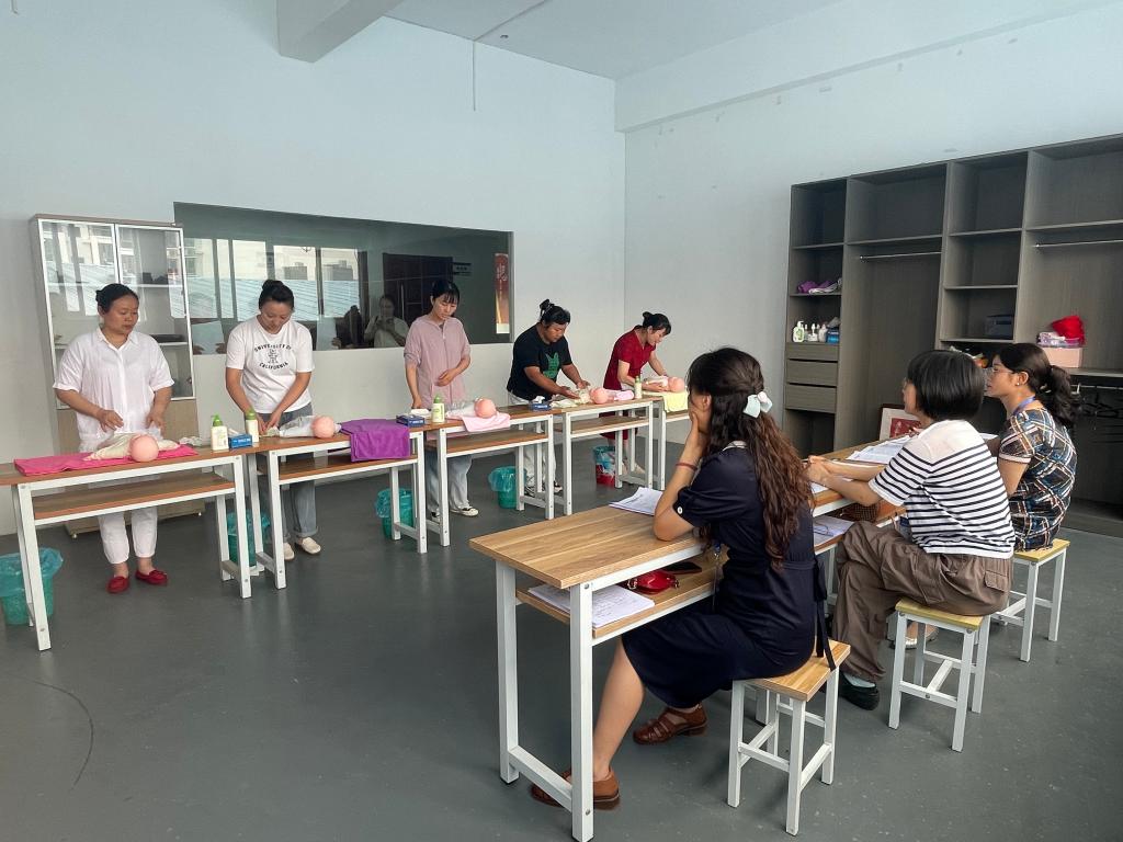 本次认定分为理论考试和实操考试两部分。理论考试主要考查考生对婴幼儿生活照料、保健护理和健康管理等基础知识的理解与掌握程度。实操考核检验考生实际操作能力,由护理学院派出六名考评员组成考评小组,按照育婴员国家职业技能等级标准要求进行打分测评。
