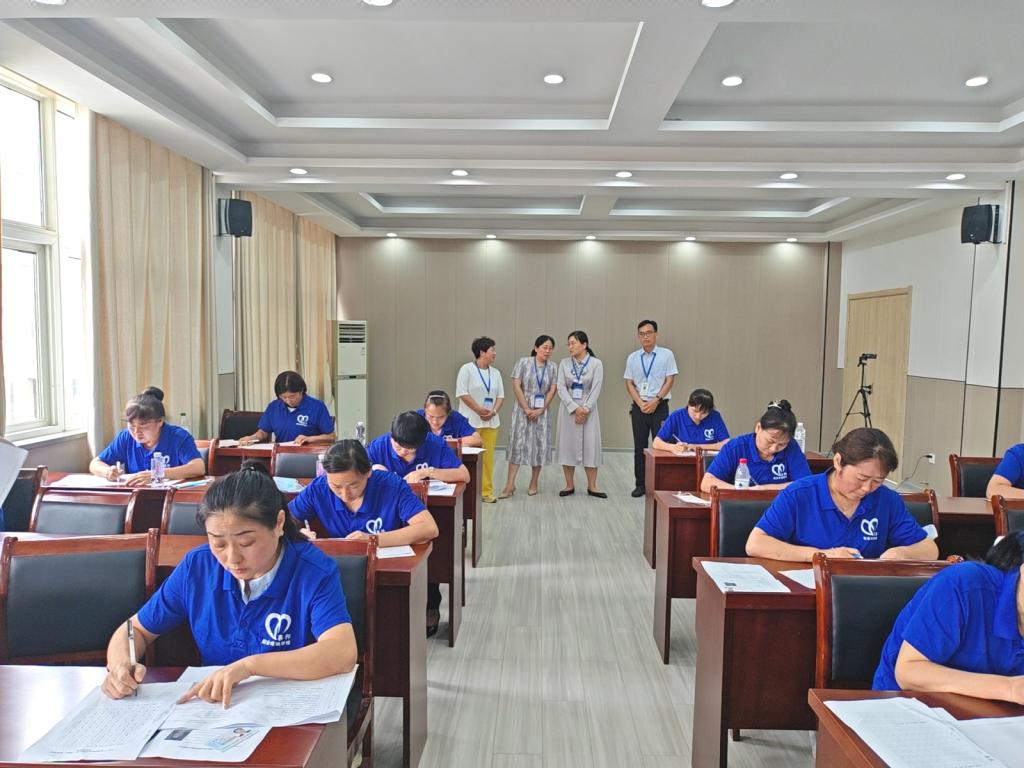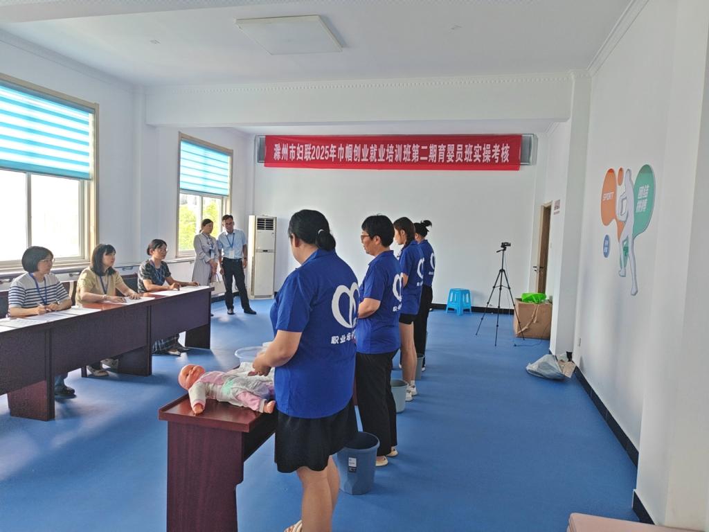 为贯彻落实《国务院办公厅关于促进家政服务业提质扩容的意见》(国办发〔2019〕30号)和《安徽省妇联、安徽省财政厅关于印发<安徽省促进妇女健康和创业扶持转移支付资金管理办法>、<安徽省促进妇女健康和创业扶持项目管理办法>的通知》(皖妇〔2025〕1号)等文件精神,继7 月 3 日我校与全椒县喜邦职业培训学校联合开展养老护理员初级职业技能等级认定后,7 月 22 日,双方再次携手,开展了 52 名育婴员初级职业技能等级认定。校党委委员、副校长孙静,全椒县妇联主席郑平,副主席王广萍,继续教育学院副院长孟红军到现场巡考。